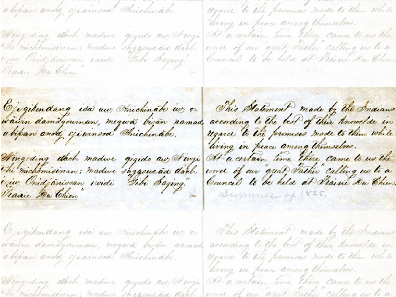 Ojibwe (left) and English statement to the US government, noting that promises made to the Ojibwe were not in the treaties (1864).