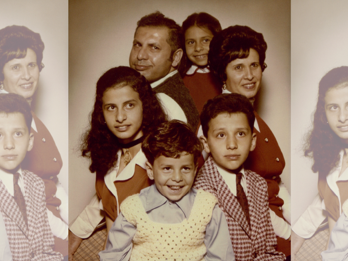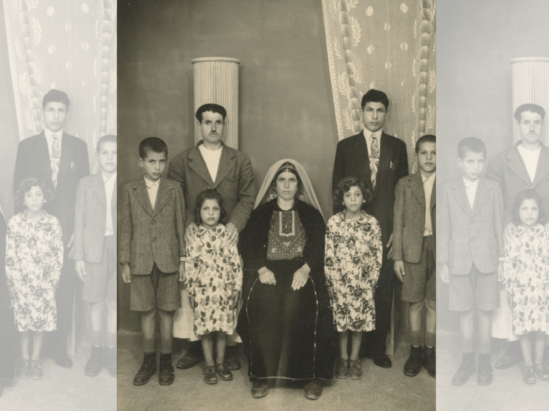 Young Mahmoud in the dark suit at right with his siblings, mother, and uncle in Palestine.