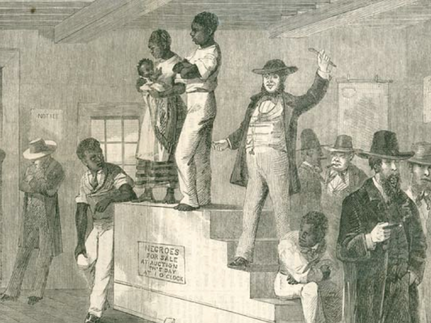 Enslaved people were often sold in an auction, as in this depiction of an auction at Richmond, Virginia, from 1856.
